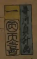 Les deux panneaux portent les marques associées à l'éditeur Tenki. Le sceau est une version stylisée du caractère 天 (« dix ») contenu dans un cercle. Cela apparaît directement au-dessus des caractères complets pour Tenki (天喜)[3]. Opérant sous le nom commercial Kinkadō (金華堂), Tenki, ou Tenmaya Kihei (天満屋喜兵衛) comme elle est également connue, est une maison d'édition active de 1816 jusque dans les années 1850[4]. Andreas Marks, spécialiste de l'ukiyo-e, note que la version du sceau qui apparaît dans la Vue du parc Tempōzan à Naniwa est utilisée par Tenki sur les impressions de 1826 à 1838[5].