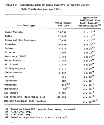 Selon le tableau 6-3 du rapport WASH-1400, les individus ont moins de 1 chance sur 5 000 000 000 de mourir chaque année de l'exploitation de 100 centrales nucléaires aux États-Unis. C'est moins que le risque annuel d'être frappé par la foudre et d'être tué (1 sur 20 000 000), d'être victime d'une collision automobile mortelle (1 chance sur 3 000 de mourir)[2].