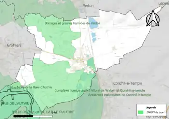 - le complexe humide arrière littoral de Waben et Conchil-le-temple. Cette ZNIEFF est constituée de polders bordant la baie d’Authie, gagnés sur la mer, cultivés ou exploités en herbages, avec la présence de nombreuses mares drainées par un réseau de fossés[19] ;