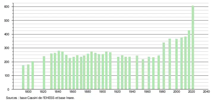 L'évolution du nombre d'habitants est connue à travers les recensements de la population effectués dans la commune depuis 1793. Pour les communes de moins de 10 000 habitants, une enquête de recensement portant sur toute la population est réalisée tous les cinq ans, les populations légales des années intermédiaires étant quant à elles estimées par interpolation ou extrapolation[19]. Pour la commune, le premier recensement exhaustif entrant dans le cadre du nouveau dispositif a été réalisé en 2006[20].