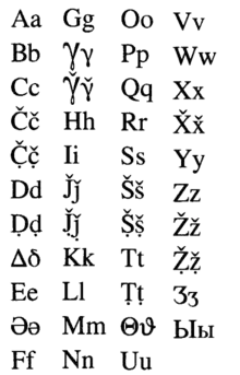 | A | B | C | Č | Č̣ | D | Ḍ | Δ | E | Ə | F | G | Ɣ | Ɣ̌ | H | I | J | J̣̌ | K | L | M | N | O | P | Q | R | S | Š | Ṣ̌ | T | Ṭ | Θ | U | V | W | X | X̌ | Y | Z | Ž | Ẓ̌ | Ʒ | Ы | |||