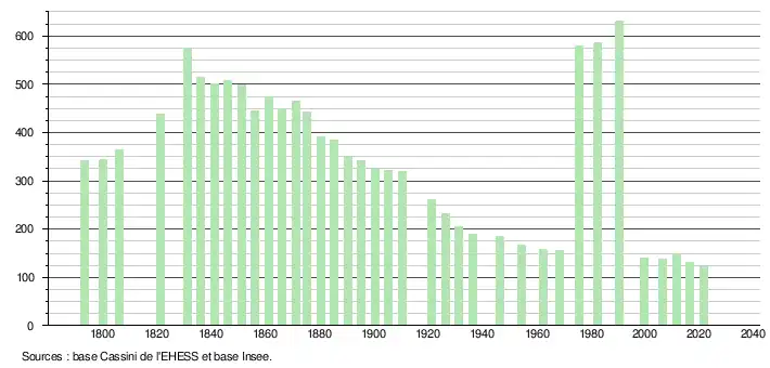 L'évolution du nombre d'habitants est connue à travers les recensements de la population effectués dans la commune depuis 1793. Pour les communes de moins de 10 000 habitants, une enquête de recensement portant sur toute la population est réalisée tous les cinq ans, les populations légales des années intermédiaires étant quant à elles estimées par interpolation ou extrapolation[16]. Pour la commune, le premier recensement exhaustif entrant dans le cadre du nouveau dispositif a été réalisé en 2006[17].