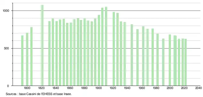 L'évolution du nombre d'habitants est connue à travers les recensements de la population effectués dans la commune depuis 1793. Pour les communes de moins de 10 000 habitants, une enquête de recensement portant sur toute la population est réalisée tous les cinq ans, les populations légales des années intermédiaires étant quant à elles estimées par interpolation ou extrapolation[28]. Pour la commune, le premier recensement exhaustif entrant dans le cadre du nouveau dispositif a été réalisé en 2007[29].