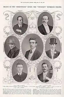 Cependant, d'autres considèrent que l'action de l'orchestre a coûté la mort à beaucoup, en créant un sentiment de confiance et en incitant les passagers à rester à bord[10]. Les témoignages diffèrent, mais la plupart des survivants ont déclaré que Hartley et ses hommes étaient restés sur le pont jusqu'à la fin en enchaînant les valses et ragtimes. Il est probable qu'ils aient joué jusque vers 2 heures, après quoi la gîte prise par le navire ne devait plus le leur permettre[11]. Un débat subsiste cependant sur le dernier air joué, généralement considéré comme étant l'hymne Plus près de toi, mon Dieu, bien que d'autres comme l'opérateur radio Harold Bride parlent du cantique Autumn et de la valse Songe d'Automne[12]. L'idée que Plus près de toi, mon Dieu ait pu être joué est renforcée par le fait que, lorsqu'il servait à bord du Mauretania, Hartley avait dit à ses collègues que c'est l'hymne qu'il jouerait s'il devait se trouver sur un navire en train de couler[13].