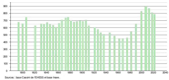 L'évolution du nombre d'habitants est connue à travers les recensements de la population effectués dans la commune depuis 1793. Pour les communes de moins de 10 000 habitants, une enquête de recensement portant sur toute la population est réalisée tous les cinq ans, les populations légales des années intermédiaires étant quant à elles estimées par interpolation ou extrapolation[27]. Pour la commune, le premier recensement exhaustif entrant dans le cadre du nouveau dispositif a été réalisé en 2007[28].