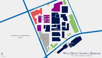 La Buena Vista Drive sépare les studios de l'hôpital, c'est l'ancienne entrée principale et l'adresse officielle des studios. Une route, Riverside Drive, longe la Ventura Freeway et coupe la zone en deux. Au nord c'est le complexe principal, au sud on retrouve le Feature Animation Building. et l'ABC Building. L’Alameda Avenue délimite au nord les studios et c'est sur cette rue que se trouve la nouvelle entrée principale.