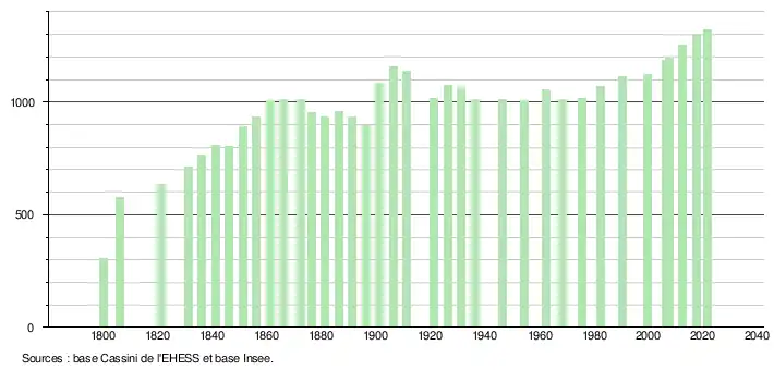 L'évolution du nombre d'habitants est connue à travers les recensements de la population effectués dans la commune depuis 1800. Pour les communes de moins de 10 000 habitants, une enquête de recensement portant sur toute la population est réalisée tous les cinq ans, les populations légales des années intermédiaires étant quant à elles estimées par interpolation ou extrapolation[30]. Pour la commune, le premier recensement exhaustif entrant dans le cadre du nouveau dispositif a été réalisé en 2007[31].