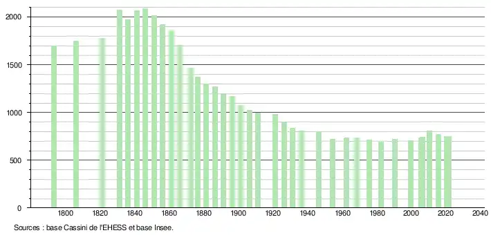 L'évolution du nombre d'habitants est connue à travers les recensements de la population effectués dans la commune depuis 1793. Pour les communes de moins de 10 000 habitants, une enquête de recensement portant sur toute la population est réalisée tous les cinq ans, les populations légales des années intermédiaires étant quant à elles estimées par interpolation ou extrapolation[24]. Pour la commune, le premier recensement exhaustif entrant dans le cadre du nouveau dispositif a été réalisé en 2005[25].