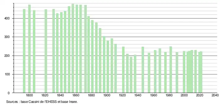 L'évolution du nombre d'habitants est connue à travers les recensements de la population effectués dans la commune depuis 1793. Pour les communes de moins de 10 000 habitants, une enquête de recensement portant sur toute la population est réalisée tous les cinq ans, les populations légales des années intermédiaires étant quant à elles estimées par interpolation ou extrapolation[28]. Pour la commune, le premier recensement exhaustif entrant dans le cadre du nouveau dispositif a été réalisé en 2004[29].