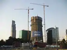 Le complexe Warsaw Spire dans son environnement : le Warsaw Trade Tower et la station de métro en construction (août 2014).