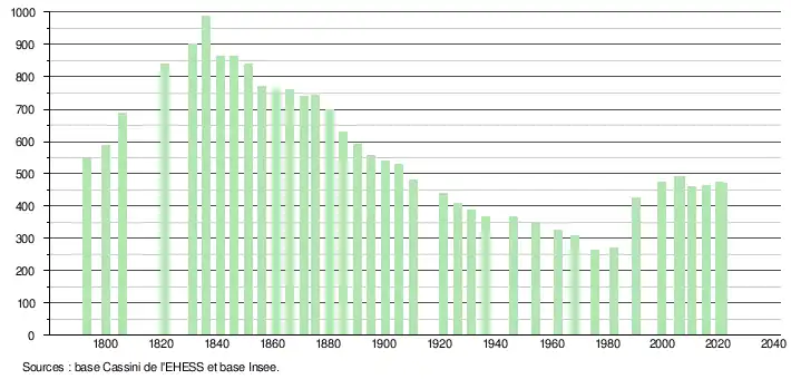 L'évolution du nombre d'habitants est connue à travers les recensements de la population effectués dans la commune depuis 1793. Pour les communes de moins de 10 000 habitants, une enquête de recensement portant sur toute la population est réalisée tous les cinq ans, les populations légales des années intermédiaires étant quant à elles estimées par interpolation ou extrapolation[18]. Pour la commune, le premier recensement exhaustif entrant dans le cadre du nouveau dispositif a été réalisé en 2005[19].