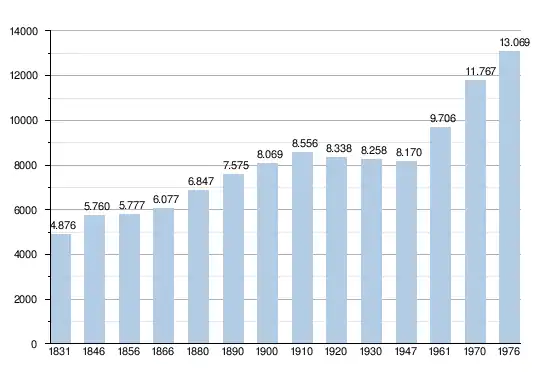 En tenant compte des anciennes communes entraînées dans la fusion de communes de 1977, on peut dresser l'évolution suivante[2]: