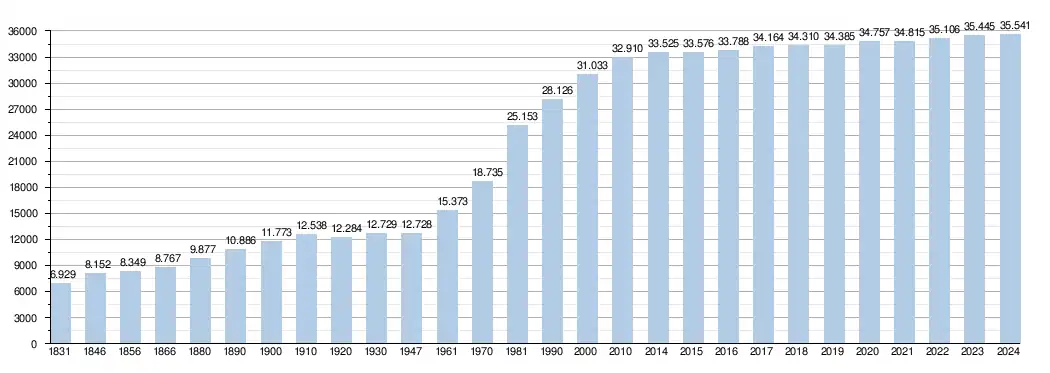 Elle comptait, au , 35 617 habitants (17 179 hommes et 18 438 femmes), soit une densité de 845,81 habitants/km²[2] pour une superficie de 42,11 km².