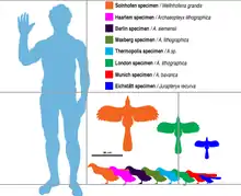 Tailles de Wellnhoferia grandis comparées à des spécimens d’Archeopteryx et avec un humain (Homo sapiens).