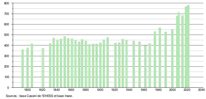 L'évolution du nombre d'habitants est connue à travers les recensements de la population effectués dans la commune depuis 1793. Pour les communes de moins de 10 000 habitants, une enquête de recensement portant sur toute la population est réalisée tous les cinq ans, les populations légales des années intermédiaires étant quant à elles estimées par interpolation ou extrapolation[15]. Pour la commune, le premier recensement exhaustif entrant dans le cadre du nouveau dispositif a été réalisé en 2008[16].
