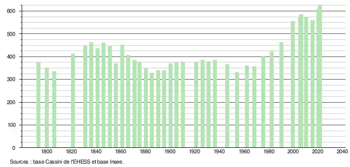 L'évolution du nombre d'habitants est connue à travers les recensements de la population effectués dans la commune depuis 1793. Pour les communes de moins de 10 000 habitants, une enquête de recensement portant sur toute la population est réalisée tous les cinq ans, les populations légales des années intermédiaires étant quant à elles estimées par interpolation ou extrapolation[15]. Pour la commune, le premier recensement exhaustif entrant dans le cadre du nouveau dispositif a été réalisé en 2005[16].