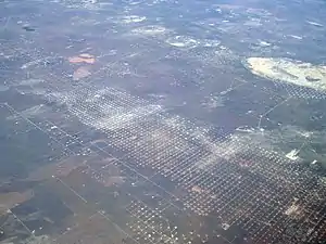 Photo aérienne oblique de Wickett, face au nord-est, montrant une multitude de puits de gaz naturel, en 2011