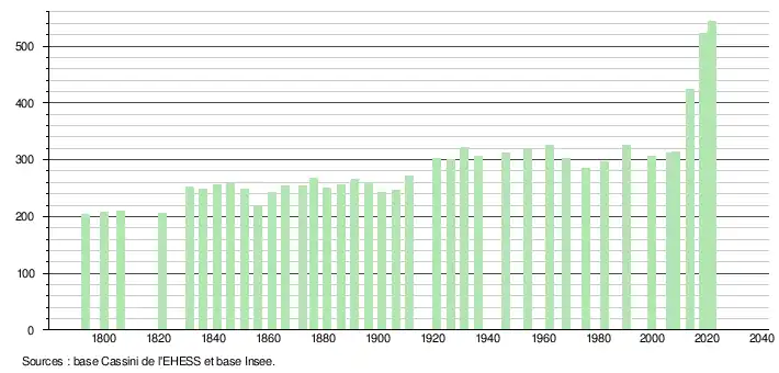 L'évolution du nombre d'habitants est connue à travers les recensements de la population effectués dans la commune depuis 1793. Pour les communes de moins de 10 000 habitants, une enquête de recensement portant sur toute la population est réalisée tous les cinq ans, les populations légales des années intermédiaires étant quant à elles estimées par interpolation ou extrapolation[29]. Pour la commune, le premier recensement exhaustif entrant dans le cadre du nouveau dispositif a été réalisé en 2008[30].