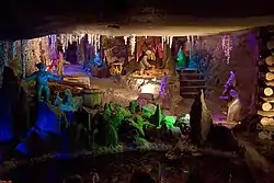 Un ensemble de sculptures taillées dans les blocs de sel illustre la légende de la découverte de la mine et accueille le visiteur à son arrivée au premier niveau souterrain.