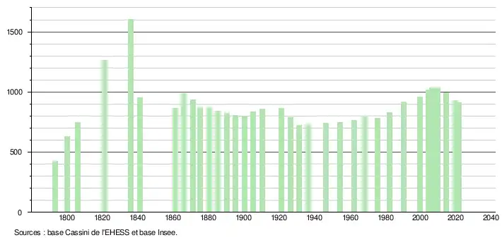 L'évolution du nombre d'habitants est connue à travers les recensements de la population effectués dans la commune depuis 1793. Pour les communes de moins de 10 000 habitants, une enquête de recensement portant sur toute la population est réalisée tous les cinq ans, les populations légales des années intermédiaires étant quant à elles estimées par interpolation ou extrapolation[16]. Pour la commune, le premier recensement exhaustif entrant dans le cadre du nouveau dispositif a été réalisé en 2004[17].