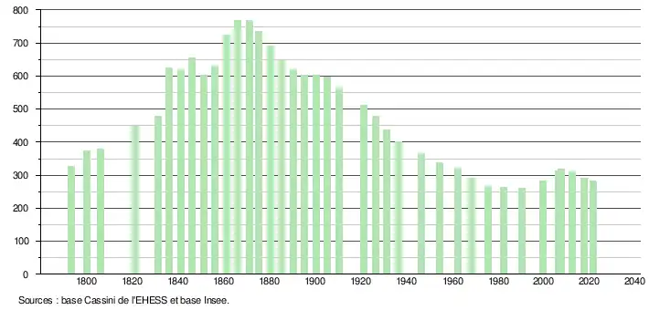 L'évolution du nombre d'habitants est connue à travers les recensements de la population effectués dans la commune depuis 1793. Pour les communes de moins de 10 000 habitants, une enquête de recensement portant sur toute la population est réalisée tous les cinq ans, les populations légales des années intermédiaires étant quant à elles estimées par interpolation ou extrapolation[17]. Pour la commune, le premier recensement exhaustif entrant dans le cadre du nouveau dispositif a été réalisé en 2007[18].