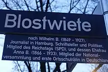 Avec sa femme, il est l'homonyme de Blosweg et Blostwiete à Hambourg-Horn, Wilhelm-Blos-Straße à Louisbourg et Stuttgart, ainsi que Wilhelm-Blos-Straße à Wertheim am Main et à Berlin-Mahlsdorf.