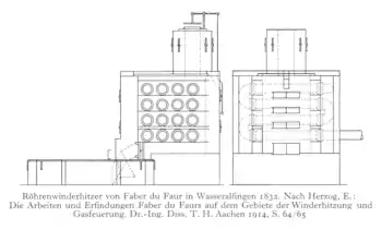 Le gaz de haut fourneau a été utilisé pour préchauffer le vent insufflé dans le haut fourneau. L'appareil mis au point par Faber du Faur, entièrement métallique, était capable de chauffer le vent jusqu'à 370 °C et, dans ses dernières versions, d'atteindre 540 °C, ce qui correspond à la limite des températures possibles avec la métallurgie de l'époque. Malgré son mauvais rendement (les fumées sortaient du réchauffeur avec une température de 875 à 676 °C), sa fragilité (les coudes des conduites étaient des points faibles évidents) et ses pertes de charge (l'air s'échauffant, son volume augmente, et donc sa vitesse, car il reste dans le même tuyau de section constante)[5],[note 3], le « four à vent de Wasseralfingen » correspondait à un investissement plus faible que les fours de Neilson.