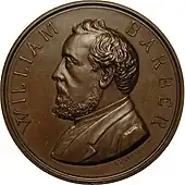 William Barber conçoit et grave un certain nombre de médailles. Parmi celles-ci, on peut citer la médaille de la « colonne brisée » de 1869 commémorant l'assassinat de Lincoln, la populaire médaille du chemin de fer du Pacifique de 1869, la médaille du centenaire de 1876, encore plus populaire, et la deuxième médaille d'investiture d'Ulysses S. Grant. Ce que la plupart des gens ignorent, c'est que William Barber conçoit ce qui aurait été la première pièce commémorative américaine, si elle avait été fabriquée. Les esquisses originales d'un quart de dollar à tête de liberté doivent commémorer le début du deuxième siècle de la nation. Malheureusement, la beauté du dessin ne permet pas de surmonter le manque d'intérêt pour l'idée de la pièce, et celle-ci n'atteint jamais le stade du modèle[6],[7].