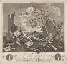 En 1724, Hogarth découvre que sa gravure The Bad Taste of the Town a été piratée, fait d'autant plus rageant que c'était là sa première gravure originale qu'il lançait lui-même dans le commerce au prix d'un shilling[18]. Le jeune homme entre cette même année dans l'académie de dessin fondée trois ans auparavant par James Thornhill à Covent Garden. Peu de temps après, Hogarth tombe amoureux et s'enfuit avec la fille du maître, Jane, qui du coup n'aura point de dot[19]. De leurs côtés, les sœurs de William ouvrent une boutique de modiste sur Long Walk près de l'hôpital de St Bartholomew[20]. En , vont paraître dix-sept gravures destinées à l'illustration d'un ouvrage, le Hudibras, de Samuel Butler, qui lui fournit également le sujet de douze estampes publiées séparément, Les Croupions brûlent à Temple Bar (Burning ye Rumps at Temple Bar), vendues par le marchand Philip Overton[21].