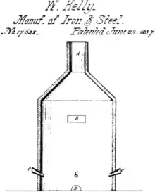 Dès 1847, il commence une série d'expériences[note 1] pour décarburer la fonte liquide par l'emploi de l'air seul. En 1851, il expose les principes de l'affinage de la fonte à l'air à quelques maîtres de forges et métallurgistes locaux. Cependant si le procédé est théoriquement capable de convertir la fonte en fer, il n'est pas breveté[4]. Un des témoins des essais réalisés par Kelly décrivait en effet son convertisseur comme « indescriptiblement primitif[2] ».