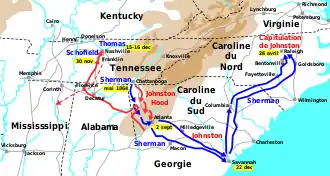 Après Atlanta, Sherman entreprend de faire marche plein Sud, en déclarant qu'il « va faire hurler la Géorgie ». Sherman néglige initialement l'armée de John Bell Hood qui fait mouvement au Tennessee, mais il doit rapidement envoyer des troupes pour le contrer[54].