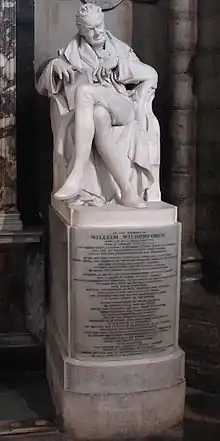 Wilberforce avait demandé à être enterré avec sa sœur et sa fille à Stoke Newington au nord de Londres. Cependant, les membres des deux Chambres du Parlement demandèrent qu'il soit honoré par une inhumation à l'abbaye de Westminster. Sa famille accepta et le , Wilberforce fut enterré dans le transept nord à côté de son ami William Pitt[223]. De nombreux membres du parlement assistèrent à la cérémonie ainsi que de nombreux badauds[224],[225],[226]. Alors que les hommages arrivaient du monde entier, les deux Chambres du Parlement suspendirent leurs travaux en témoignage de leur respect[227].