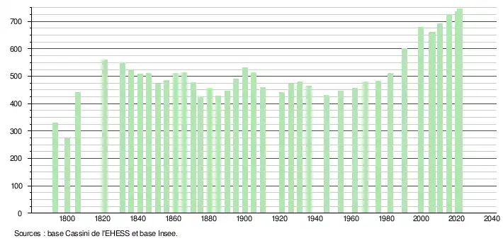 L'évolution du nombre d'habitants est connue à travers les recensements de la population effectués dans la commune depuis 1793. Pour les communes de moins de 10 000 habitants, une enquête de recensement portant sur toute la population est réalisée tous les cinq ans, les populations légales des années intermédiaires étant quant à elles estimées par interpolation ou extrapolation[17]. Pour la commune, le premier recensement exhaustif entrant dans le cadre du nouveau dispositif a été réalisé en 2005[18].