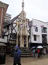 La City Cross (également connue sous le nom de Buttercross) date du XVe siècle et comprend 12 statues de la Vierge Marie, des saints et divers personnages historiques. Plusieurs statues semblent avoir été ajoutées tout au long de l'histoire de la structure. En 1770, Thomas Dummer achète le Buttercross à la Corporation of Winchester, avec l'intention de le faire reconstruire à Cranbury Park, près d'Otterbourne. Lorsque ses ouvriers arrivent pour démonter la croix, ils en sont empêchés par les habitants qui « ont organisé une petite émeute »[30] et sont contraints d'abandonner leur tâche. L'accord avec la ville est annulé et Dummer érige une copie de lattes et de plâtre, qui reste dans le parc pendant environ soixante ans avant d'être détruite par les intempéries[31]. Le Buttercross lui-même a été restauré par George Gilbert Scott en 1865 et se trouve toujours dans High Street. C'est maintenant un scheduled monument[32].