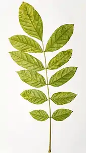 Les feuilles, alternes, composées imparipennées, peuvent atteindre 40 cm de long. Chaque feuille compte de 7 à 13 folioles (contre 13 à 19 folioles chez Wisteria floribunda), ovales à elliptiques, de 10 cm de long sur 6 cm de large, aux marges entières et à la base arrondies. Les folioles sont couvertes de poils soyeux lorsqu'elles sont très jeunes et deviennent presque glabres par la suite. Le pétiole atteint 10 cm de long, avec une base enflée (pulvinus)[11].