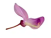 Les fleurs, de type papilionacé, voyantes et légèrement odorantes, de 2,5 cm de long environ, sont de couleur lilas très pale à plus ou moins foncé, parfois blanche[11].