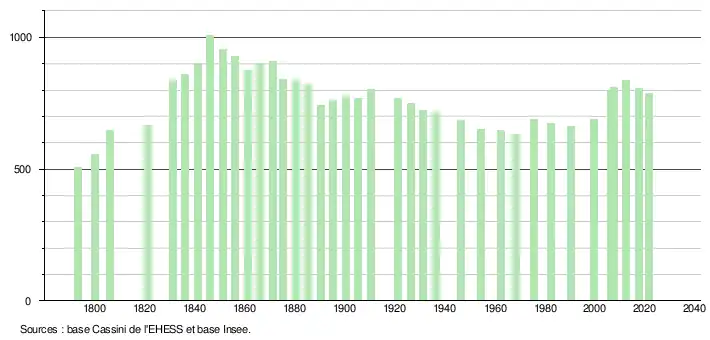 L'évolution du nombre d'habitants est connue à travers les recensements de la population effectués dans la commune depuis 1793. Pour les communes de moins de 10 000 habitants, une enquête de recensement portant sur toute la population est réalisée tous les cinq ans, les populations légales des années intermédiaires étant quant à elles estimées par interpolation ou extrapolation[15]. Pour la commune, le premier recensement exhaustif entrant dans le cadre du nouveau dispositif a été réalisé en 2007[16].