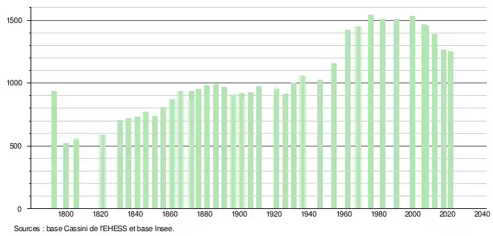 L'évolution du nombre d'habitants est connue à travers les recensements de la population effectués dans la commune depuis 1793. Pour les communes de moins de 10 000 habitants, une enquête de recensement portant sur toute la population est réalisée tous les cinq ans, les populations légales des années intermédiaires étant quant à elles estimées par interpolation ou extrapolation[22]. Pour la commune, le premier recensement exhaustif entrant dans le cadre du nouveau dispositif a été réalisé en 2007[23].