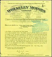 En 1913, Wolseley était le plus grand fabricant de voitures de Grande-Bretagne, vendant plus de 3000 voitures[11]. L'entreprise fut renommée Wolseley Motors Limited en 1914.