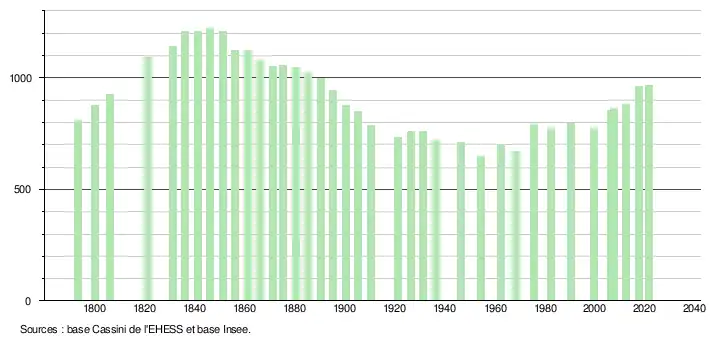 L'évolution du nombre d'habitants est connue à travers les recensements de la population effectués dans la commune depuis 1793. Pour les communes de moins de 10 000 habitants, une enquête de recensement portant sur toute la population est réalisée tous les cinq ans, les populations légales des années intermédiaires étant quant à elles estimées par interpolation ou extrapolation[19]. Pour la commune, le premier recensement exhaustif entrant dans le cadre du nouveau dispositif a été réalisé en 2007[20].