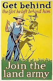 Le Conseil de l'Agriculture institue la Women's Land Army pendant la Première Guerre, à partir de 1915. Vers la fin de 1917, il y avait environ de 250 000 à 260 000 femmes travaillant comme ouvriers agricoles, dont 23 000 dans la WLA elle-même, effectuant des tâches comme la traite des vaches et la cueillette des fruits.