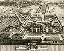 Le parc est divisé par une large promenade centrale en gravier, poursuivie par un long canal qui mène à une maison de banquet dans un pavillon baroque conçu par Thomas Archer (en) et achevé en 1711 [7]. Le concepteur de jardin Batty Langley est employé dans les années 1730 [8]. L'intérieur du pavillon est décoré d'impressionnantes colonnes ioniques en trompe-l'œil. Les canaux de délimitation sont modifiés pour prendre une forme plus naturelle par Capability Brown, qui y travaille entre 1758 et 1760, et qui entoure la zone formelle centrale d'un canal et d'un bois. Les jardins et les maisons de jardin sont cartographiés par John Rocque en 1735 [9]. Au cours des XVIIIe et XIXe siècles [8], une orangerie et des fontaines en marbre sont ajoutées. Le bain public (parfois appelé bain romain, ermitage et grotte) est construit et ses terrains aménagés entre 1769 et 1772 environ [8],[10].