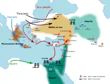 - 1200-1180 av. J.-C. : « effondrement de l'âge du bronze »[15], ou temps de la confusion au Proche-Orient. Invasion des Peuples de la mer, ensemble de peuples mal connus d’origine méditerranéenne[16]. De nombreuses villes du sud de la Syrie et de Canaan sont détruites. Un fragment de vase portant le cartouche de la reine d’Égypte Taousert trouvé dans la couche détruite de Deir Alla (en) sur le Jourdain, permet de la dater après 1190 av. J.-C.[17]. L’empire hittite s’effondre vers 1180-1170 av. J.-C. sous les coups des Phrygiens, peuple indo-européen associé aux Mushki. Ils s’allient aux Gasgas et occupent la majeure partie de l’Anatolie, refoulant les Louvites au-delà du Taurus[11]. Ougarit, importante cité syrienne, est saccagée durant la même période, toujours par les Peuples de la mer. L’Égypte résiste sous Ramsès III, puis se replie, ce qui crée un vide politique en Syrie et en Palestine qui favorise l’émergence de pouvoirs locaux[18] :