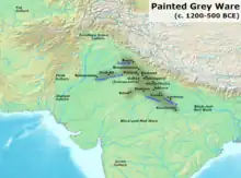 - 1200-600 av. J.-C. : la culture de la céramique grise peinte succède à la culture de la céramique noire et rouge dans la vallée du Gange en Inde[4]. Cette culture archéologique correspondant aux débuts de l’âge du fer est liée par quelques chercheurs à l’arrivée des Aryens, cavaliers indo-européens armés de fer venus du nord-ouest, qui auraient pu contribuer au déclin de la culture de Harappa[5]. Leur progression est facilitée par leurs rapides chars de combat tirés par des chevaux, leurs arcs, lances, haches de guerre, armures et casques. Ils introduisent la langue védique et on leur doit la rédaction des Veda. L’économie aryenne est mixte, pastorale et agricole. Le bétail joue un rôle important, et constitue une valeur, voire un moyen de paiement. Le cheval est utilisé à des fins militaires (char à deux roues). Chèvres et moutons fournissent la laine. Les mentions concernant l’agriculture sont rares et cette activité semble être considérée comme plébéienne.