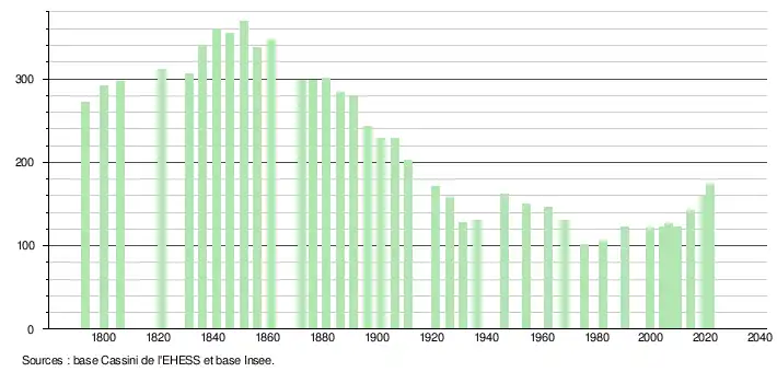 L'évolution du nombre d'habitants est connue à travers les recensements de la population effectués dans la commune depuis 1793. Pour les communes de moins de 10 000 habitants, une enquête de recensement portant sur toute la population est réalisée tous les cinq ans, les populations légales des années intermédiaires étant quant à elles estimées par interpolation ou extrapolation[17]. Pour la commune, le premier recensement exhaustif entrant dans le cadre du nouveau dispositif a été réalisé en 2004[18].