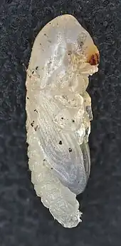 Ses larves sont d'apparence similaire à d'autres larves de coléoptères, se développant comme un « ver blanc » sans pattes, avec une capsule céphalique de couleur ambre[7]. Ses chrysalides sont blanchâtres, exarées (avec des appendices libres) et de taille similaire à celle de l'adulte[8].