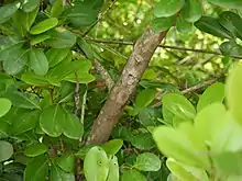 C'est un arbre ou un arbuste mesurant jusqu'à 5 m de haut. Les branches sont grises, lisses et glabres. Les feuilles sont longues d'environ 15 cm. Le pétiole et le rachis sont cylindriques, glabres ; le pétiole est long de 3 à 5 cm. Les feuilles comptent généralement quatre folioles opposées ; les pétiolules mesurent environ 4 mm, la base gonflée ; les folioles ont le limbe elliptique à obovale-oblong, long de 4 à 9 cm et large de 2,5 à 5 cm, subalterne, les deux faces glabres et généralement pâles, à 8 à 10 nervures secondaires de chaque côté de la nervure médiane ; elles sont ascendantes, s'anastomosant près du bord, réticulées éparses et plus ou moins évidentes, à base cunéiforme à largement cunéiforme, au bord entier, au sommet arrondi[3].