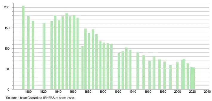 L'évolution du nombre d'habitants est connue à travers les recensements de la population effectués dans la commune depuis 1793. Pour les communes de moins de 10 000 habitants, une enquête de recensement portant sur toute la population est réalisée tous les cinq ans, les populations légales des années intermédiaires étant quant à elles estimées par interpolation ou extrapolation[15]. Pour la commune, le premier recensement exhaustif entrant dans le cadre du nouveau dispositif a été réalisé en 2008[16].