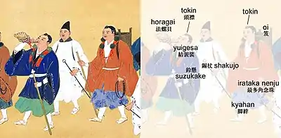 La tenue du yamabushi est caractéristique : un pectoral, le yuigesa avec six pompons (de couleur différentes suivant le rang du pratiquant), une veste (suzakake), un pantalon large (hakama), des protège-tibia appelés kyahan, des sandales (à l'origine en paille de riz) appelées waraji, et une petite coiffe noire cylindrique appelée tokin portée sur le front. Ils utilisent comme trompe une conque appelée horagai[3].