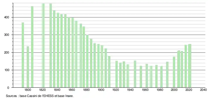 L'évolution du nombre d'habitants est connue à travers les recensements de la population effectués dans la commune depuis 1793. Pour les communes de moins de 10 000 habitants, une enquête de recensement portant sur toute la population est réalisée tous les cinq ans, les populations légales des années intermédiaires étant quant à elles estimées par interpolation ou extrapolation[19]. Pour la commune, le premier recensement exhaustif entrant dans le cadre du nouveau dispositif a été réalisé en 2005[20].